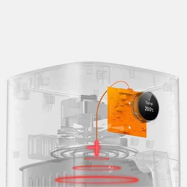 سرخکن بدون روغن شیائومی Mijia MAF02 از طراحی مینیمال با رنگ سفید و بدنهای ساخته شده از جنس پلاستیک ABS بهره میبرد. این محصول با فرم فاکتور استوانهای طراحی شده و ابعاد آن 304 در 282 در 335 میلیمتر است و 3.9 کیلوگرم وزن دارد. در زیر هواپز چهار پایه با پدهای ضدلغزش قرار دارد که امکان قرارگیری هواپز بر روی انواع سطوح صاف را میسر میکند.
